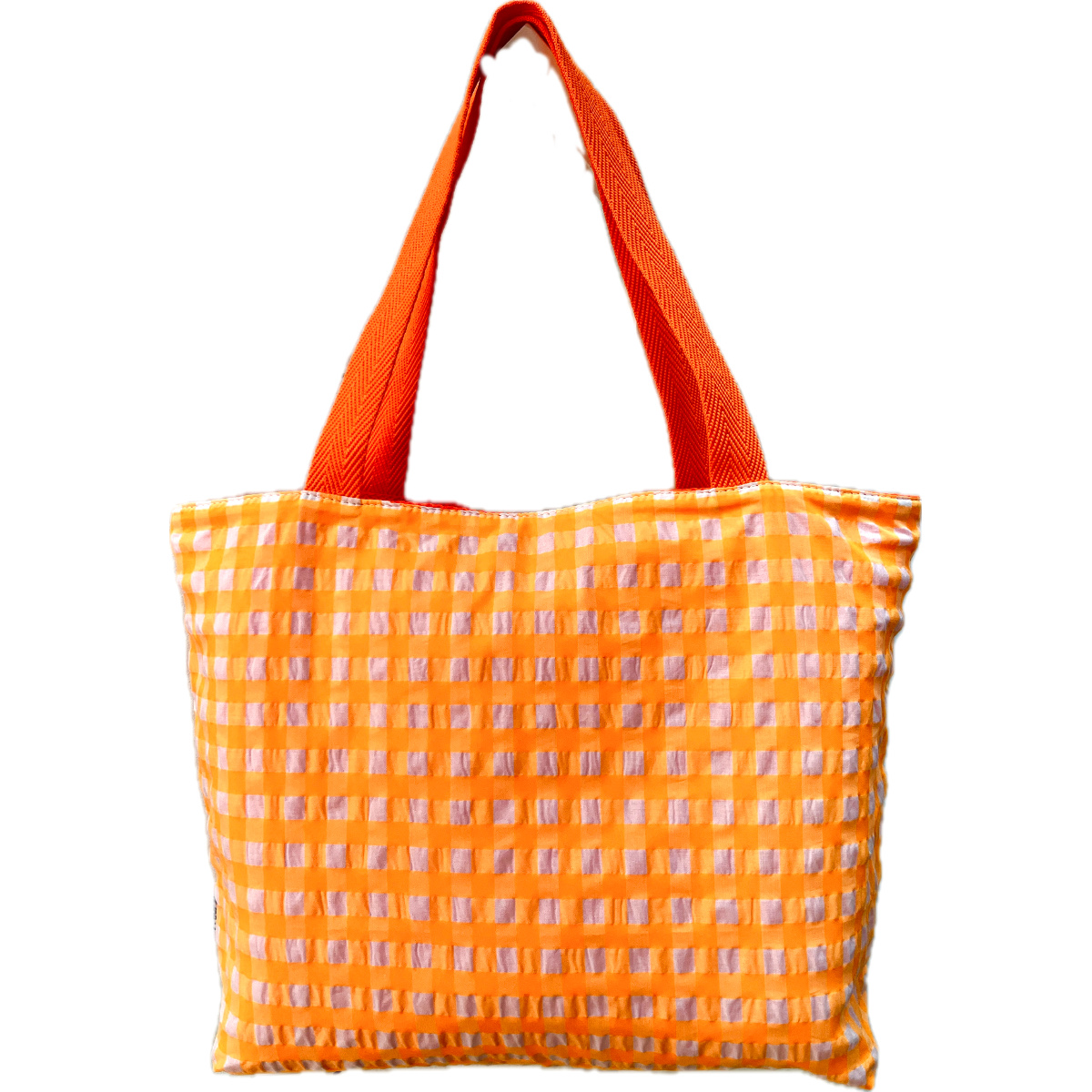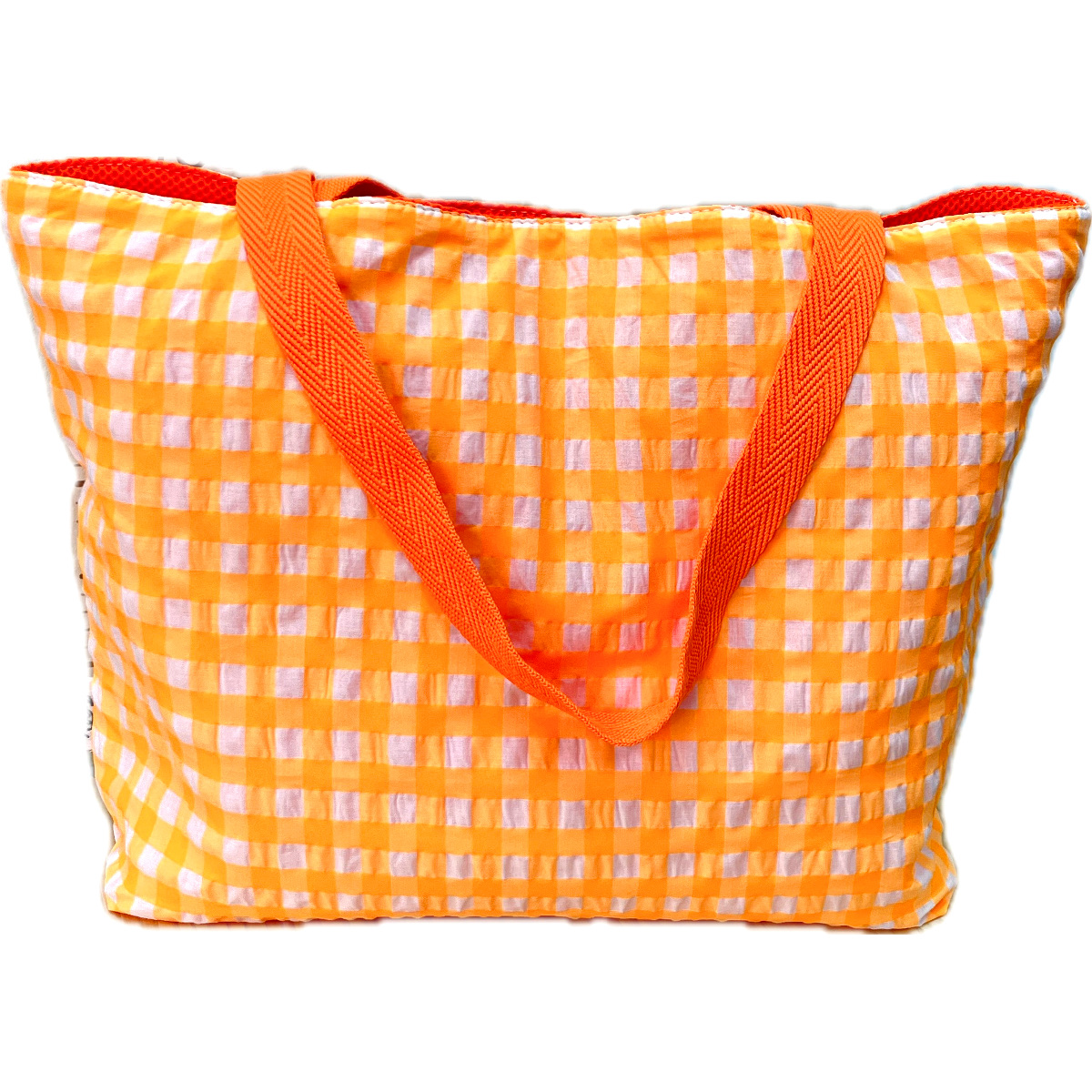 Bolsa de playa reversible con estampado vichy naranja flúor. Alegre, amplia y ligera. El complemento estrella del verano. Compra online en IsiBabyWorld.
