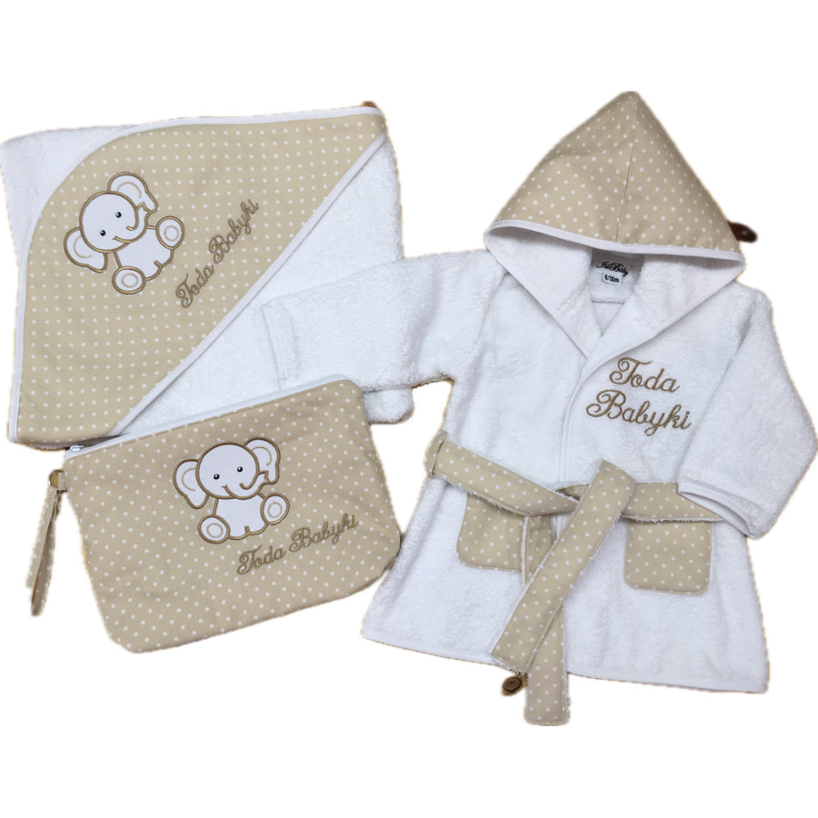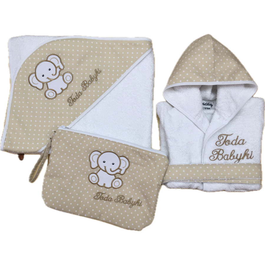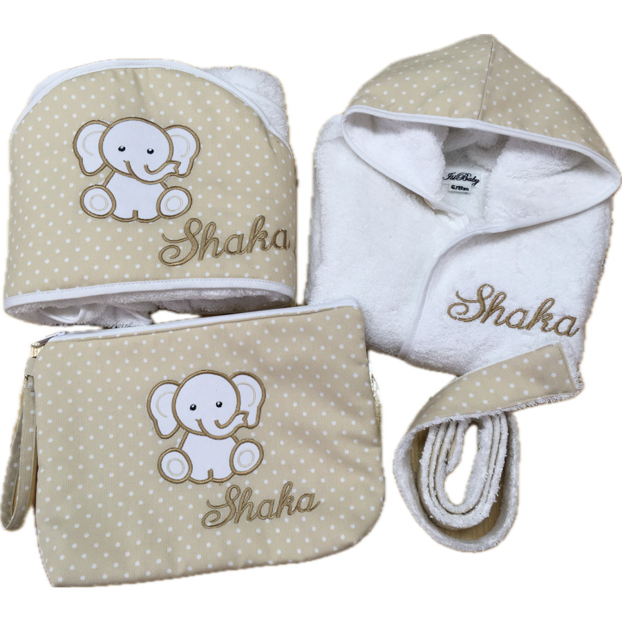 Set de accesorios de bebé personalizados compuesto por albornoz, capa de baño y neceser. Precioso elefante bordado en capa y neceser con nombre bordado.