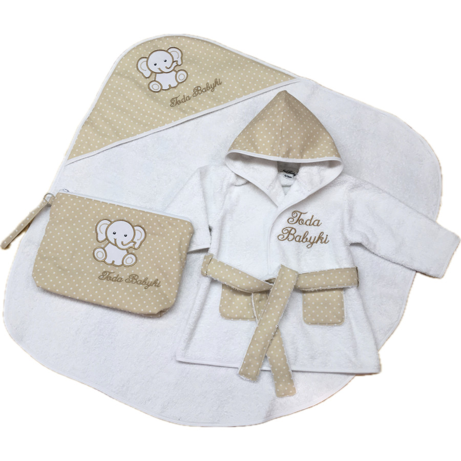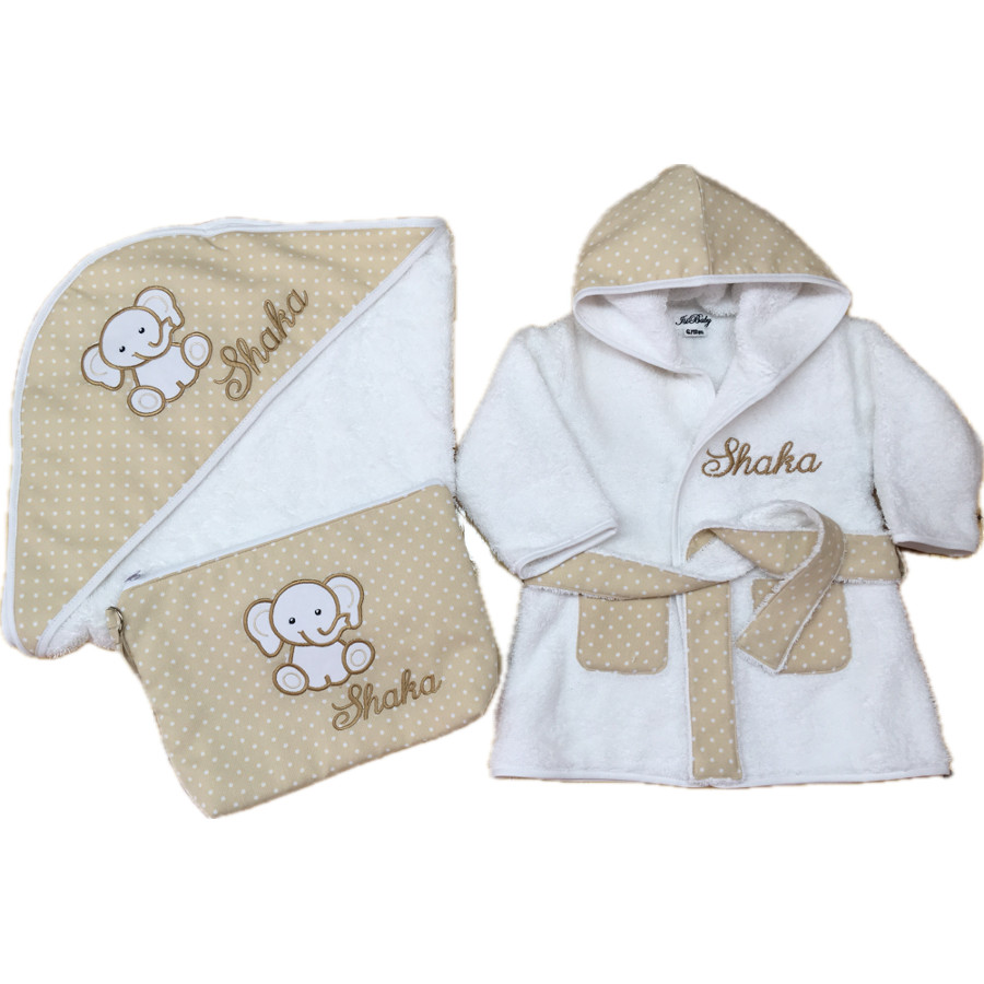 – Capa de baño felpa de rizo 100% algodón con elefante bordado y tela de topos beige