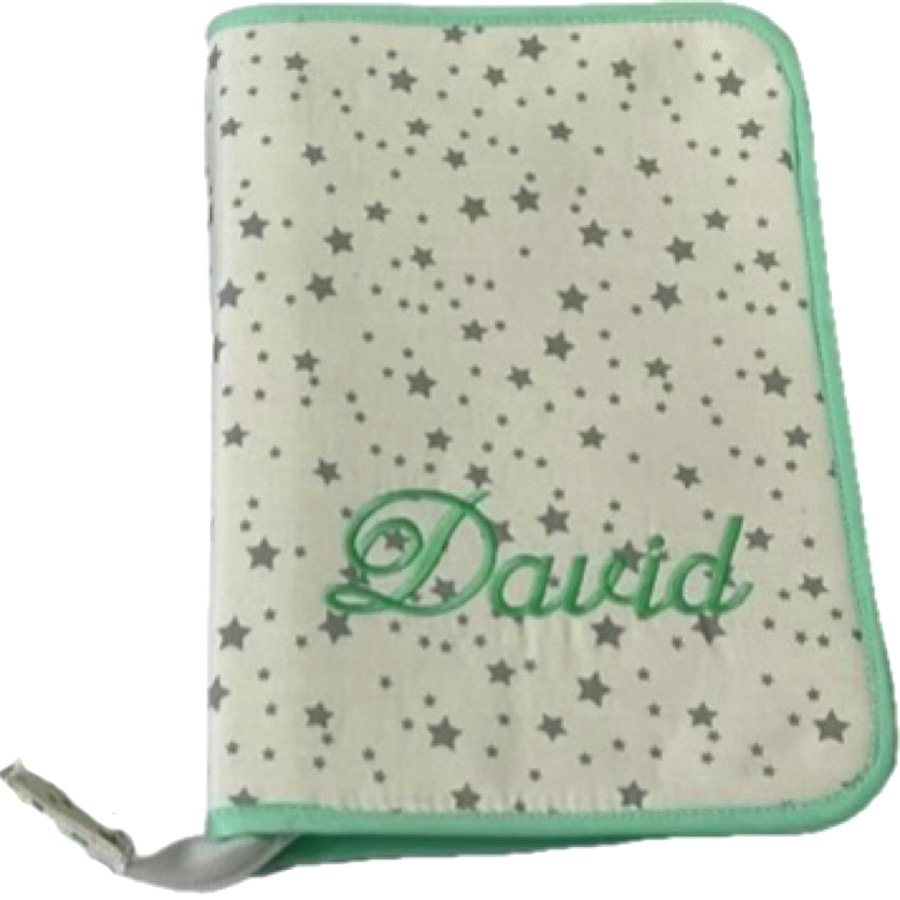 Portadocumentos personalizado para bebés ó niños realizado en tela de estrellas gris