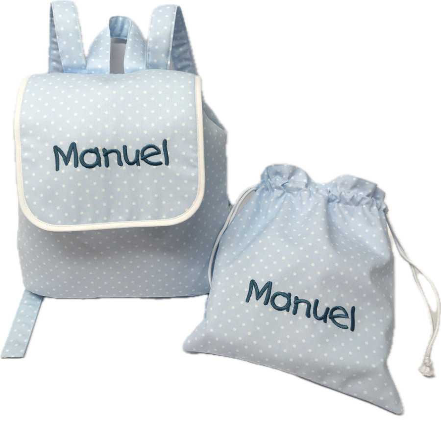 – Mochila pequeña realizada con tela de piqué de topos en azul y nombre bordado